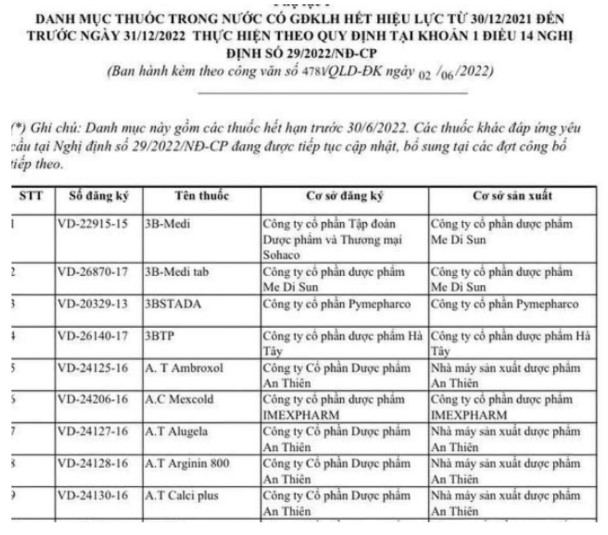 (TTV) - 6.251 thuốc có giấy đăng ký lưu hành hết hạn từ 31/12/2021 đến trước ngày 31/12/2022, đã được Cục Quản lý Dược, Bộ Y tế công bố tiếp tục sử dụng đến hết ngày 31/12/2022.
