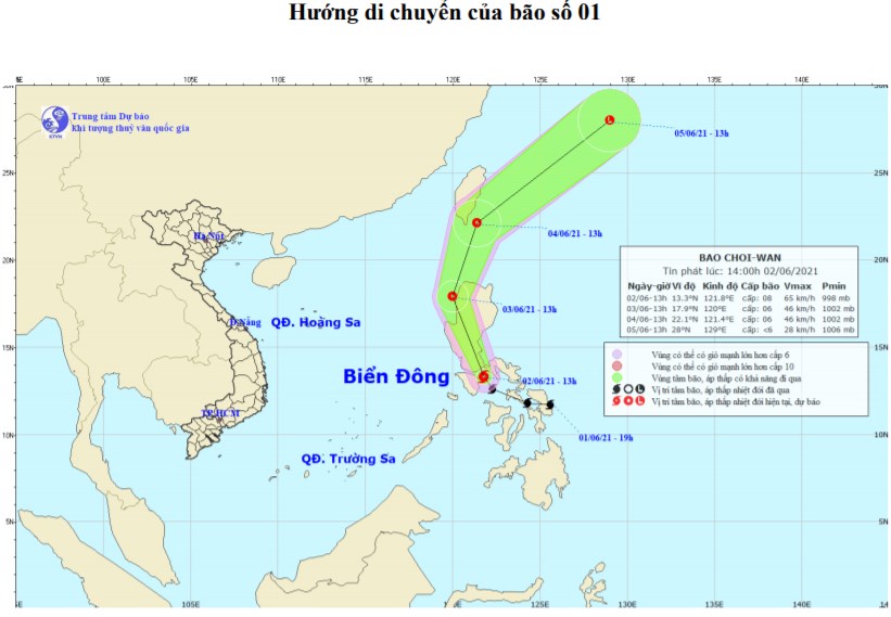 Cảnh báo tác động do bão số 1: Bão số 1 (Choi-wan) có xu hướng di chuyển lên phía Bắc, sau đó đổi hướng Đông Bắc đi ra ngoài Biển Đông và suy yếu thành áp thấp nhiệt đới. Trong chiều và đêm ngày 03/6, ở vùng biển phía Đông khu vực Bắc và giữa Biển Đông (vùng biển giới hạn từ vĩ tuyến 14,0 đến 21,0 độ Vĩ Bắc; kinh tuyến từ 117,0 đến 120,0 độ Kinh Đông) có mưa, gió mạnh cấp 6-7, vùng gần tâm bão đi qua cấp 8, giật cấp 10, biển động mạnh.