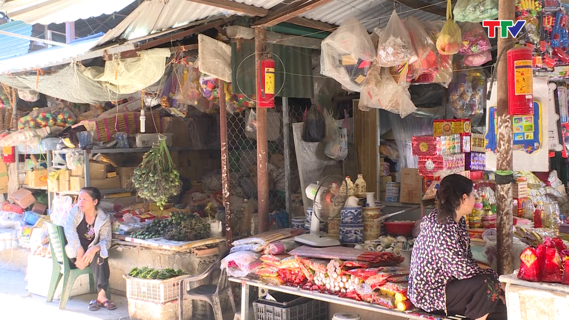 Tuy nhiên, một số hộ trong chợ Thị trấn Rừng Thông vẫn chỉ phòng chống cháy nổ một cách đối phó, chẳng hạn để hàng hóa dễ cháy cạnh các ổ điện như tại gian hàng này.