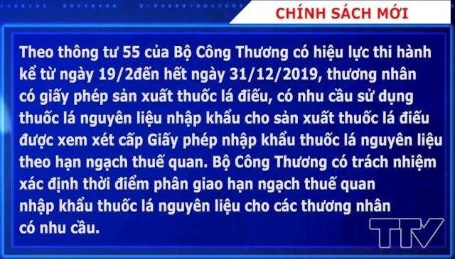 Theo thông tư 55 của Bộ Công Thương có hiệu lực thi hành kể từ ngày 19/2/2019 đến hết ngày 31/12/2019, thương nhân có giấy phép sản xuất thuốc lá điếu, có nhu cầu sử dụng thuốc lá nguyên liệu nhập khẩu cho sản xuất thuốc lá điếu được xem xét cấp Giấy phép nhập khẩu thuốc lá nguyên liệu theo hạn ngạch thuế quan. Bộ Công Thương có trách nhiệm xác định thời điểm phân giao hạn ngạch thuế quan nhập khẩu thuốc lá nguyên liệu cho các thương nhân có nhu cầu.