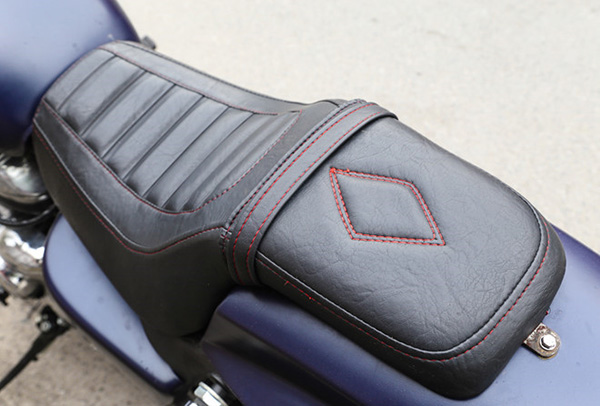 | Yên xe vẫn giữ kiểu dáng 2 tầng thuần cruise nhưng được bọc lại thủ công với chất liệu da, chỉ khâu màu đỏ tương phản khá bắt mắt. So với nguyên bản, cảm giác ngồi của yên xe êm ái hơn. |