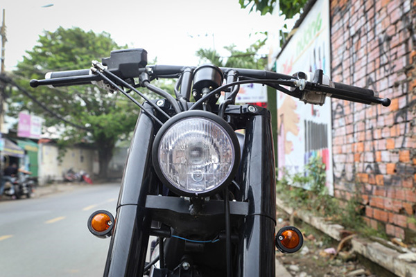 | Đèn pha dạng tròn cổ điển sử dụng bóng halogen được thay mới, nhỏ gọn hơn so với đèn nguyên bản. Bên cạnh đó, đèn xi-nhan hình quả nhót cũng khiến đầu xe trở nên gọn gàng hơn, để lộ rõ phần phuộc ống lồng kích thước lớn. |