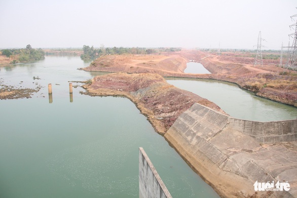 Năm 2012 - 2013, một con kênh dẫn nước (bên phải) được xây dựng "lái" dòng sông Sêrêpốk từ sau đập thủy điện Sêrêpốk 4 về thủy điện Sêrêpốk 4A để chạy máy, sau đó mới trả về dòng sông lượng nước như ban đầu - Ảnh: TRUNG TÂN