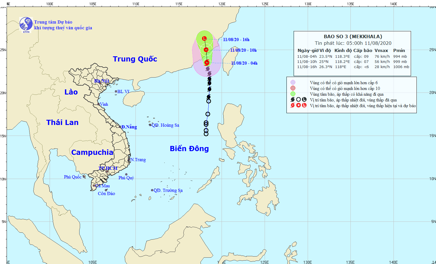Trung tâm Dự báo khí tượng thủy văn quốc gia cho biết, hồi 4h ngày hôm nay, 11/8, vị trí tâm bão số 3 ở vào khoảng 23,5 độ Vĩ Bắc, 118,3 độ Kinh Đông, ngay trên vùng biển phía Nam tỉnh Phúc Kiến (Trung Quốc). Sức gió mạnh nhất vùng gần tâm bão mạnh cấp 9 (75-90 km/giờ), giật cấp 11. Bán kính gió mạnh từ cấp 6, giật từ cấp 8 trở lên khoảng 130 km tính từ tâm bão.