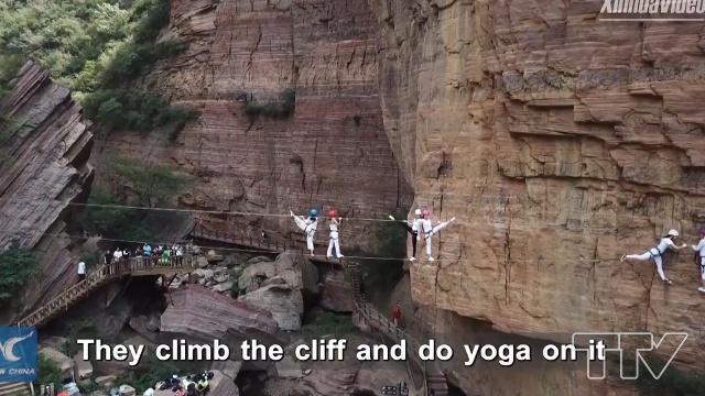 Nhóm 38 phụ nữ đã mạo hiểm đi trên dây cáp và trình diễn Yoga tập thể ở độ cao 188m trên vách dựng đứng của ngọn núi Thanh Đảo ở tỉnh Hà Nam, Trung Quốc.