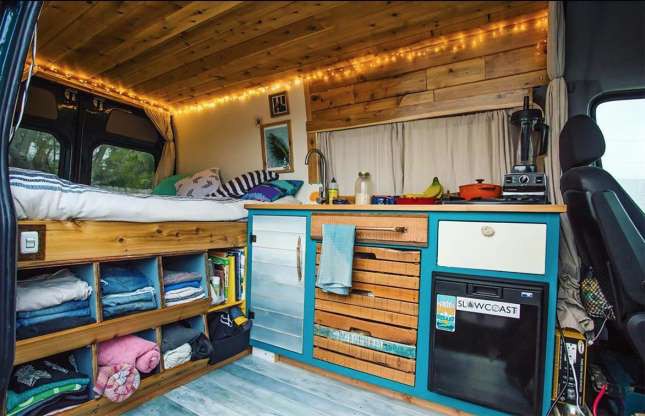 Chiếc xe van cũ ở bang California, Mỹ này đã được cải tạo thành một ngôi nhà di động trong 2 tuần. Không gian bên trong được bài trí gọn gàng với những nội thất làm từ gỗ đem lại cảm giác ấm cúng. Ảnh:Vanalog Vibes. |