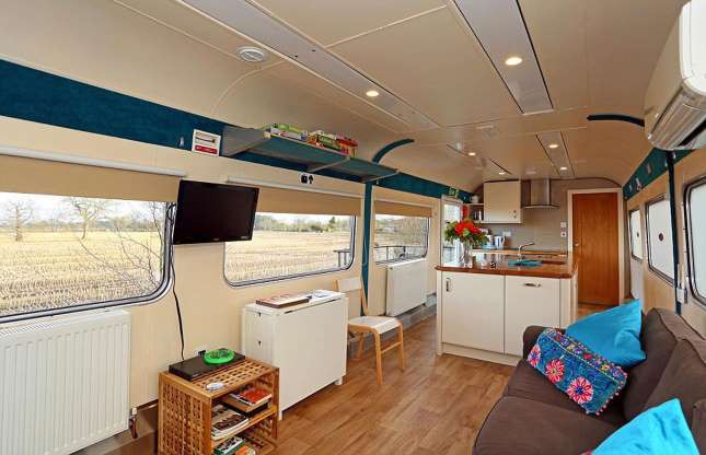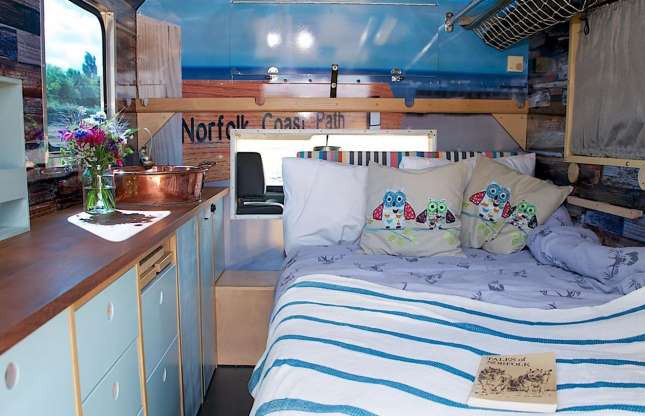 Chiếc xe cứu thương cũ của lực lượng không quân Hoàng gia Anh đã trở thành một ngôi nhà nghỉ dưỡng di động thú vị, đầy màu sắc. Nội thất bên trong được trang bị đủ để phục vụ cho một gia đình 4 thành viên. Ảnh:Quirky Campers. |