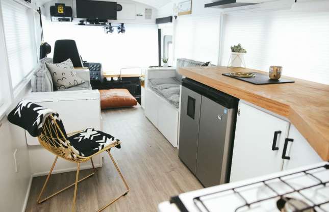 Một chiếc xe buýt chở học sinh đến trường đã được chuyển đổi thành ngôi nhà với phong cách bài trí nội thất tối giản pha lẫn các đường nét hiện đại của vùng Scandinavia. Với các tiện ích sinh hoạt đầy đủ, đây là tổ ấm của một gia đình với 6 thành viên. Ảnh:The Mayes Team. |