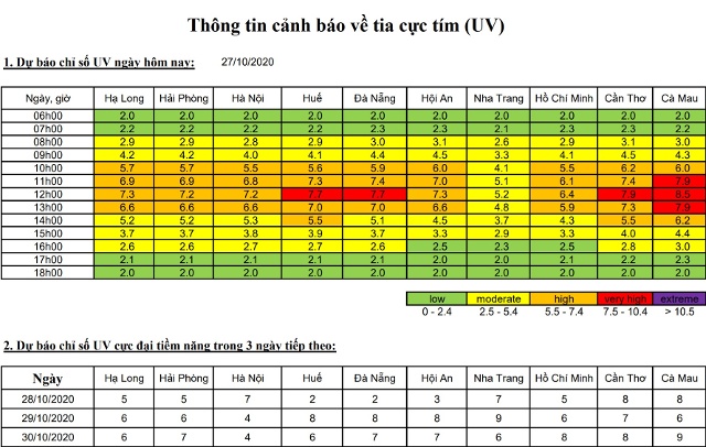 Dự bảo chỉ số UV trong ngày hôm nay, đa số các tỉnh, thành phố đều có chỉ số UV cao nhất trong ngày ở mức cao, ngoại trừ Nha Trang đạt mức trung bình, riêng Huế, Đà nẵng, Cần Thơ và Cà Mau cao nhất ở mức rất cao. Dự báo chỉ số UV cực đại tiềm năng trong 3 ngày tiếp theo, các tỉnh thành phố đa phần đều có nguy cơ gây hại trung bình, riêng Hạ Long, Hải Phòng, Huế, Đà Nẵng, Hội An, Tp. Hồ Chí Minh (ngày 27/10), Hà Nội (ngày 29 và 30/10) có nguy cơ gây hại trung bình và Nha Trang (ngày 29/10) và Cà Mau (ngày 30/10) có nguy cơ gây hại rất cao.