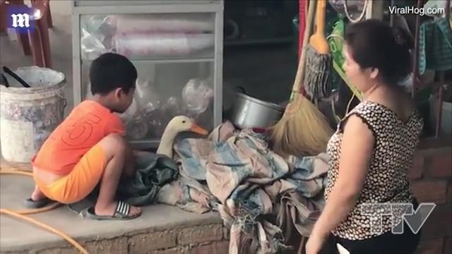 Khoảnh khắc động lòng khi một bé trai Việt Nam cố cứu một chú vịt khỏi bị giết thịt. |