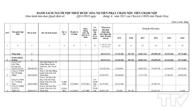 (TTV) - Chủ tịch UBND tỉnh Thanh Hóa vừa ban hành quyết định về việc xóa nợ tiền phạt chậm nộp, tiền chậm nộp đối với 04 người nộp thuế (là doanh nghiệp, tổ chức). Cụ thể như sau: